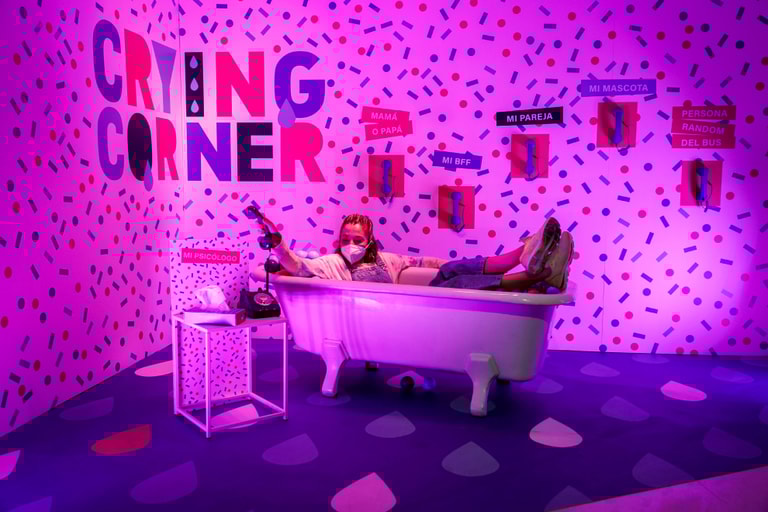 在西班牙首都馬德里的「拉洛里亞」(La Lloreria)展覽中,一名女性在浴缸中做出假裝要打電話給心理師的樣子,替自己拍下了一張照片。