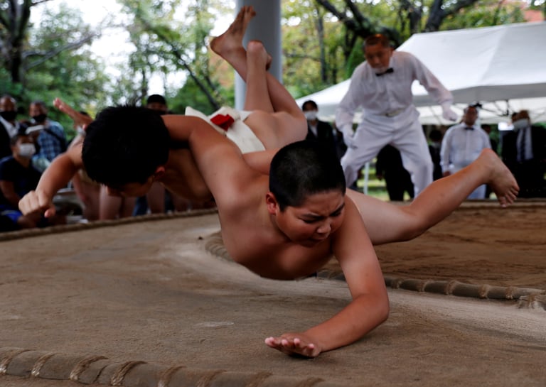 在日本川崎市的青少年奧林匹克盃全日本小學相撲錦標賽中,兩位小相撲選手激烈地打成一團。