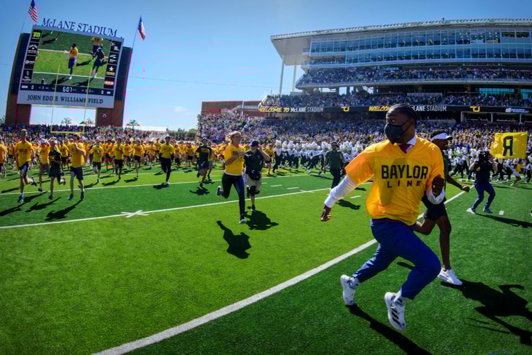 在美國德州的韋科市(Waco),前貝勒大學美式足球校隊「貝勒熊」(Baylor Bears)明星四分衛葛瑞芬三世(Robert Griffin III)在比賽開始前,帶著許多人從球場上疾奔而過。