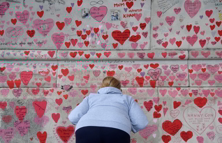 在英國首都倫敦,一名女子彎下腰、仔細看了看英國國家COVID-19紀念牆(National Covid Memorial Wall)上的愛心。這面牆是英國紀念COVID-19疫情的公共藝術品之一,上頭手繪了許多愛心,悼念罹患COVID-19病逝的病患。