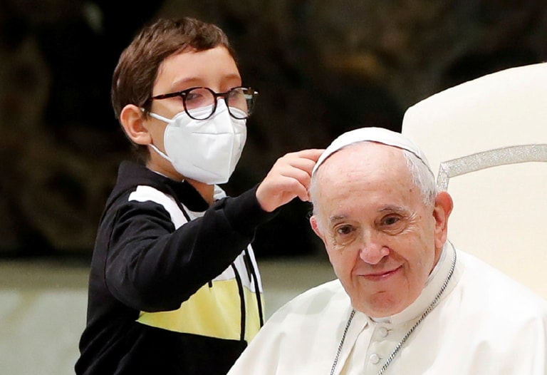 在梵蒂岡,一名男孩把握教宗方濟各(Pope Francis)每周例行的公開接見(Wednesday general audience)時間,大膽地摸了摸教宗的頭。