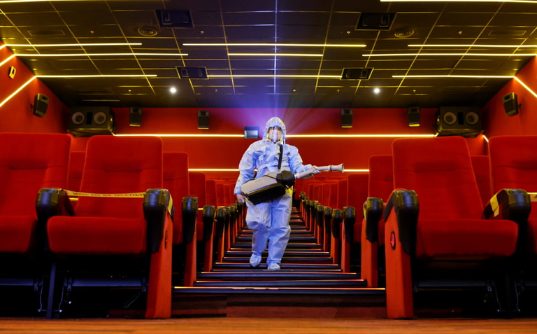 在印度大城孟買(Mumbai),眼見電影院即將重新開幕,一名工作人員穿上全套防護衣,仔細消毒影廳的每個角落。