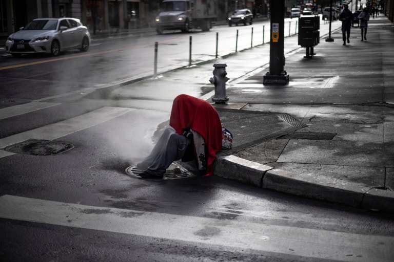 在美國加州大城舊金山(San Francisco),一名無家可歸的街友獨自坐在街角。