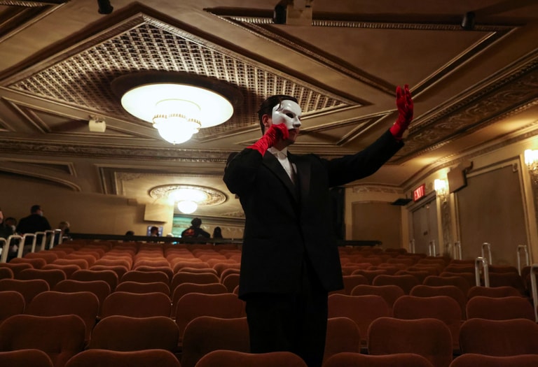 在紐約市的雄偉劇院(Majestic Theater),受到COVID-19疫情影響,一度暫停演出的知名音樂劇《歌劇魅影》(Phantom of the Opera)終於能再次上演,一名觀眾在表演結束後開心地戴上面具,在觀眾席間自拍紀念這一刻。