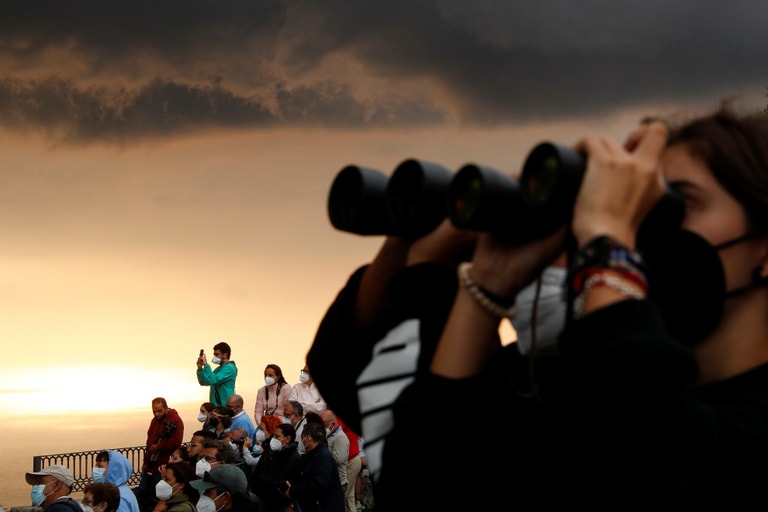 在西班牙的拉帕爾馬島(La Palma)小鎮塔居亞(Tajuya),人們拿著望遠鏡,遙望著遠方依舊在噴發中的老峰火山(Cumbre Vieja volcano)。