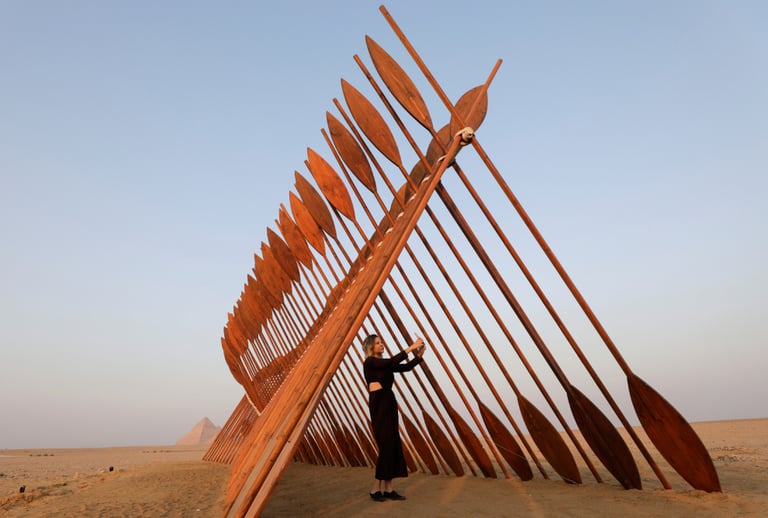 在埃及首都開羅的吉薩大金字塔(Great Pyramids of Giza)附近,一名遊客正在參觀由AI藝術家艾達(Ai Da)創作的雕塑。
