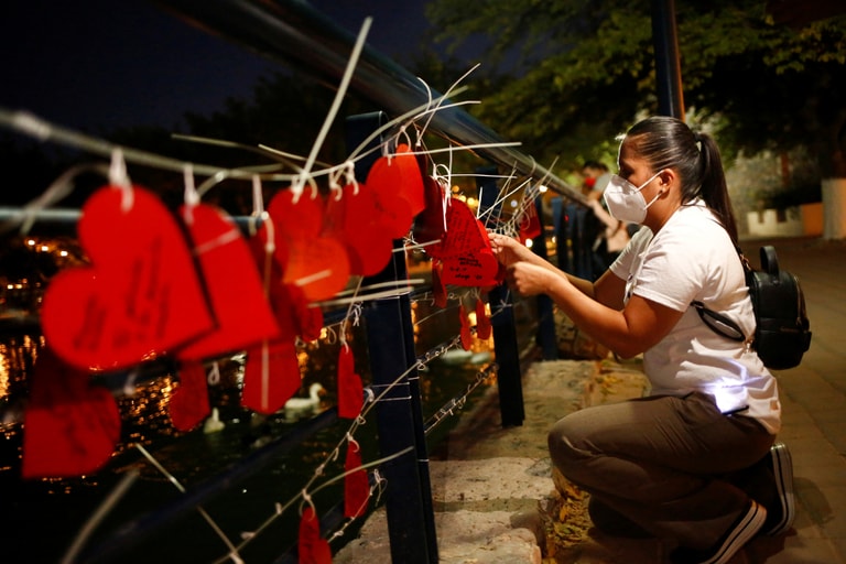 在美墨邊境的華雷斯城(Ciudad Juarez),岡薩雷斯(Gabriela Gonzalez)將寫著嫂嫂阿維萊斯(Elena Avilez)名字的愛心卡片掛上繩索,以此悼念她和其他同樣罹患COVID-19而病逝的人們。