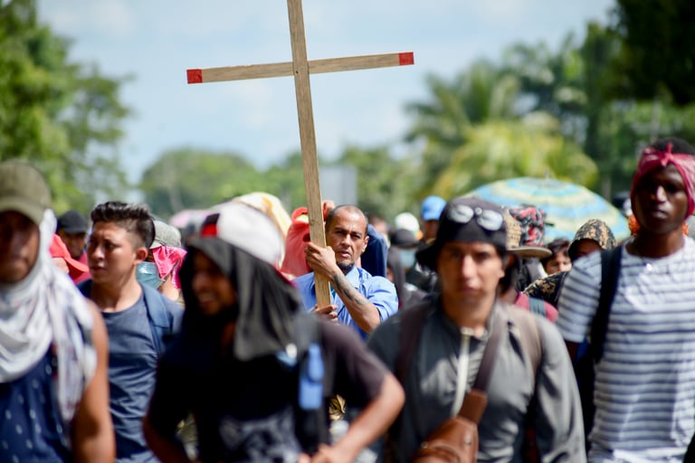 在墨西哥東南部恰帕斯州(Chiapas)的塔帕丘拉市(Tapachula),來自中美洲的車隊移民們(caravan migrants)朝著墨國首都墨西哥市走去,希望能在那裏獲得難民資格,得到庇護。
