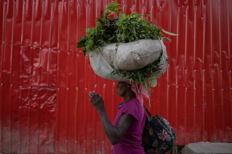在海地首都太子港(Port-au-Prince),一名女子頂著一籃蔬菜,在拉庫普市場(Marche Lacoupe market)中四處販售。