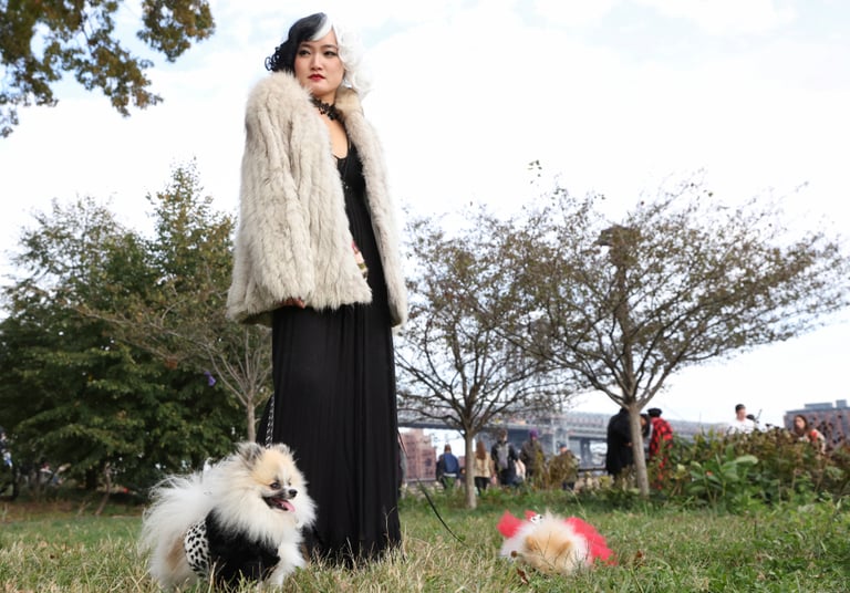 在美國紐約市,索拉亞(Seira Soraya)打扮成迪士尼(Disney)動畫《101忠狗》(One Hundred and One Dalmatians)角色庫伊拉(Cruella)的樣子,牽著狗狗杭杭(Hang Hang,音譯)和龐龐(Paung Paung,音譯),出席第 31屆湯普金斯廣場萬聖節狗狗大遊行(31st annual Tompkins Square Halloween Dog Parade)。