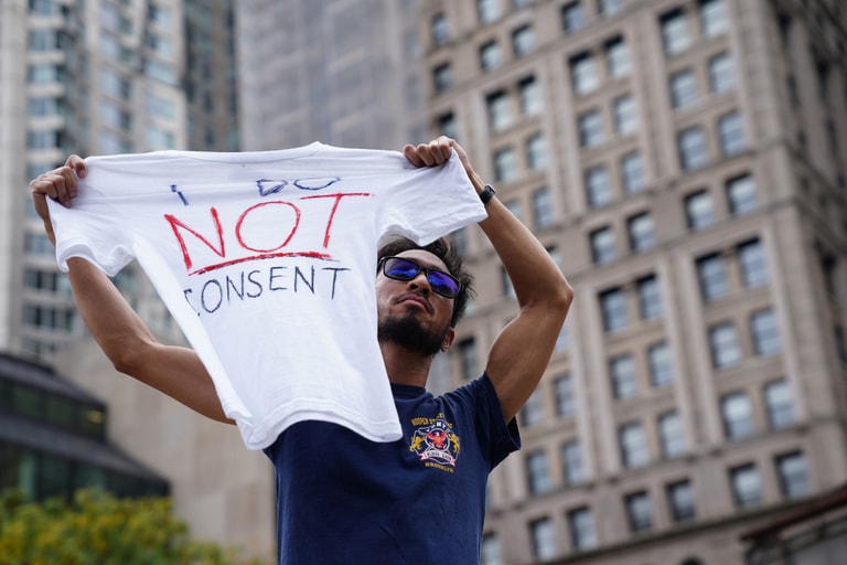 在美國紐約市,一名男子朝著鏡頭高舉起一件寫著示威標語的T恤,抗議當局強迫民眾接種COVID-19疫苗。