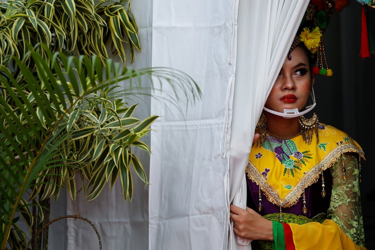 在印尼首都雅加達附近的丹戎不碌港(Tanjung Priok port),一名即將於歡迎澳洲坎培拉號兩棲攻擊艦(HMAS Canberra (L02)歡迎式上表演的舞者掀開簾幕,查看外頭的情況。