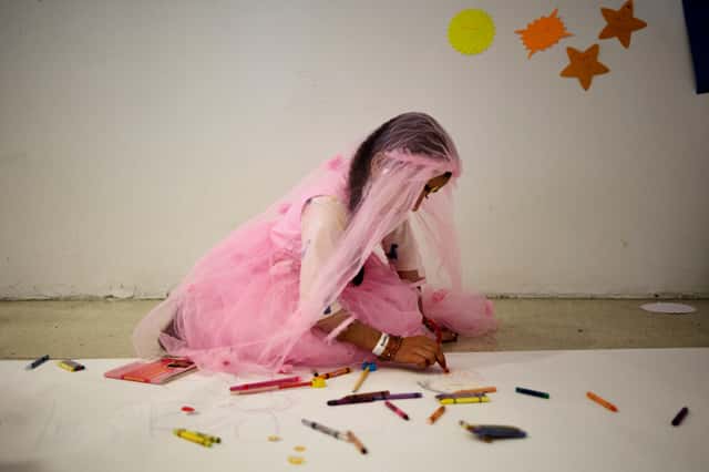 在美國東部大城費城的費城國際機場(Philadelphia International Airport),一名參加非營利組織壁畫藝術(Mural Arts)社交情緒藝術計畫的孩子,正坐在地上埋頭畫畫。