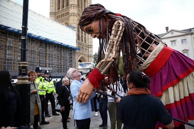 在英國首都倫敦的國會大廈(Houses of Parliament)外,高 3.5公尺的木偶「小阿莫」(Little Amal)彎下腰,準備擁抱前工黨黨魁柯賓(Jeremy Corbyn)。