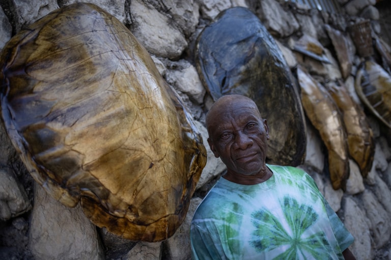 在海地首都太子港(Port-au-Prince)的路邊,販賣龜殼為生的 74歲男子多里瓦爾(Roland Dorival)與身後一整牆的龜殼拍照。