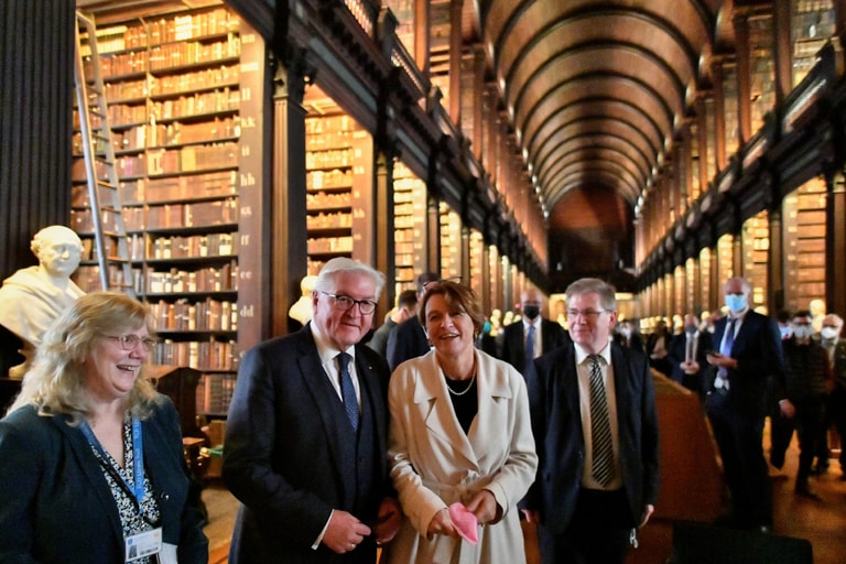 在愛爾蘭首都都柏林,德國總統史坦因邁爾(Frank-Walter Steinmeier)及夫人布登班德(Elke Büdenbender)正一起參觀聖三一學院圖書館(Library of Trinity College Dublin)知名的長閱覽室(Long Room)。