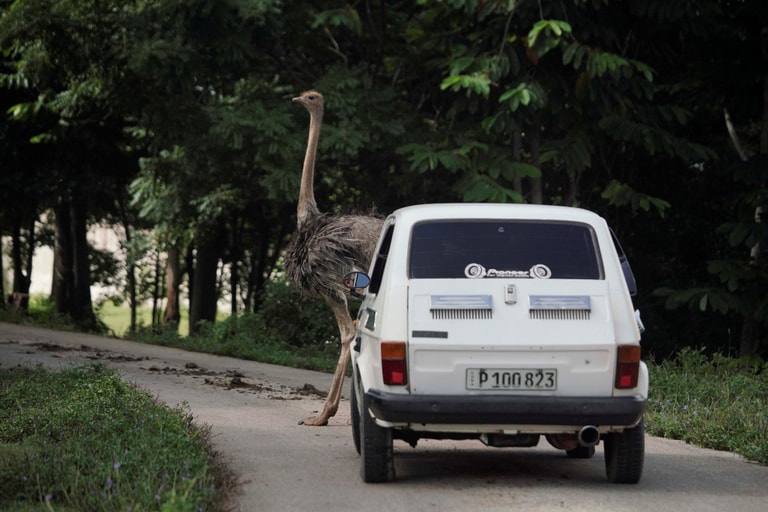 在古巴首都哈瓦那(Havana)的一座動物園,一名遊客停下車輛,讓鴕鳥可以順利地過完馬路。