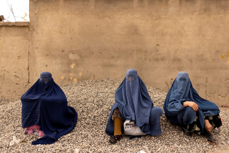 在首都喀布爾(Kabul),三名穿著罩袍的女子正坐在路邊短暫小憩。