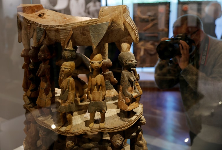 在巴黎的國家凱布朗利博物館(Musée du quai Branly),一名攝影師正在拍攝一尊來自達荷美王國(Kingdom of Dahomey)王宮的雕像。