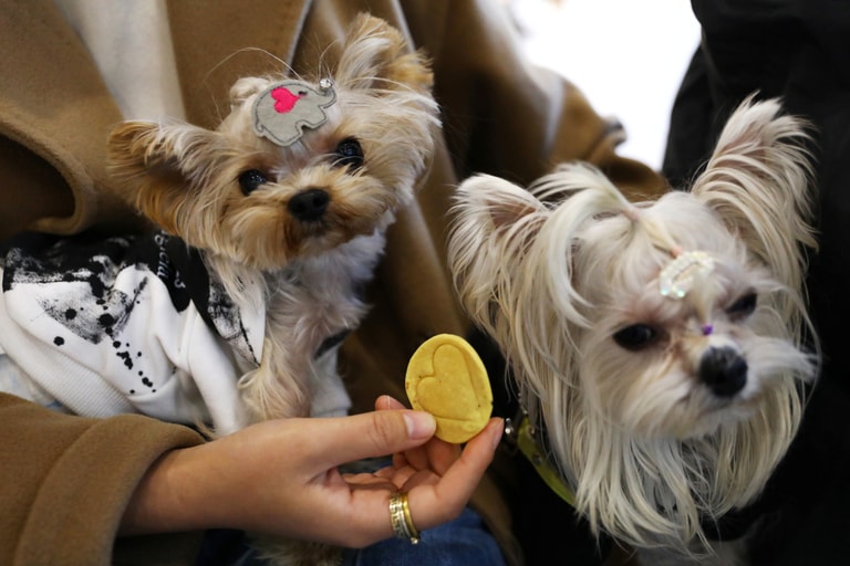 在中國首都北京,一名女子拿出一塊仿Netflix熱門影集《魷魚遊戲》(Squid Game)椪糖造型的餅乾,餵食懷裡抱著的一對狗狗。