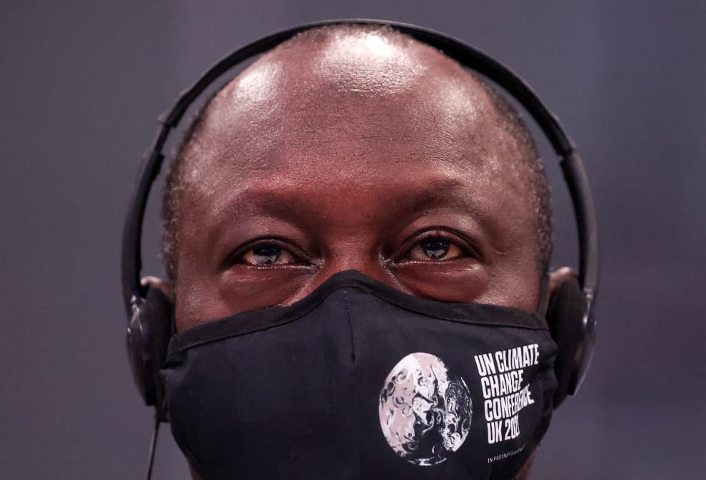 在蘇格蘭地區的首府格拉斯哥(Glasgos),一名參與第 26屆聯合國氣候變遷會議(COP26)戴著耳機,聚精會神地聆聽台上的演講。