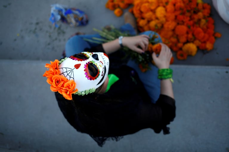 在美墨邊境的華雷斯城(Ciudad Juarez),戴著骷髏面具的梅爾喬(Rocio Melchor)在亡靈節這天來到一處紀念式現場,為那些因針對女性的暴力事件而身亡的受害者進行哀悼。