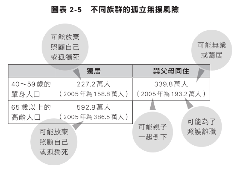 現在獨居的人也好,和父母同住的人也好,步入晚年孤立無援並非少數人才會面臨的狀況。40歲至 59歲的單身人士與 65歲以上的高齡人口逐漸增加,各自都可能面臨孤立無援的問題(圖表2–5)。