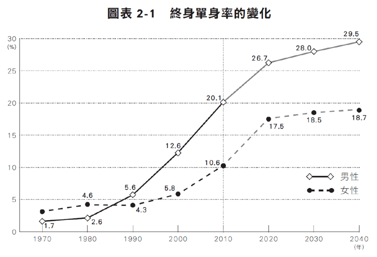 從家庭生活的角度分析,出生於平成時代的年輕人生活也不同於過去的時代。男性的終身單身率截至 1985年為 1%至 3%,到了 2010年提升至 20.1%,推估到 2040年將暴增至 29.5%;至於女性的終身單身率到了 2040年,可能由 2010年的 10.61%增加至 18.7%(圖表2–1)。雖然不能一概而論,經濟能力確實嚴重影響結婚與否,尤其在日本,男性年薪愈低,單身比例愈高。