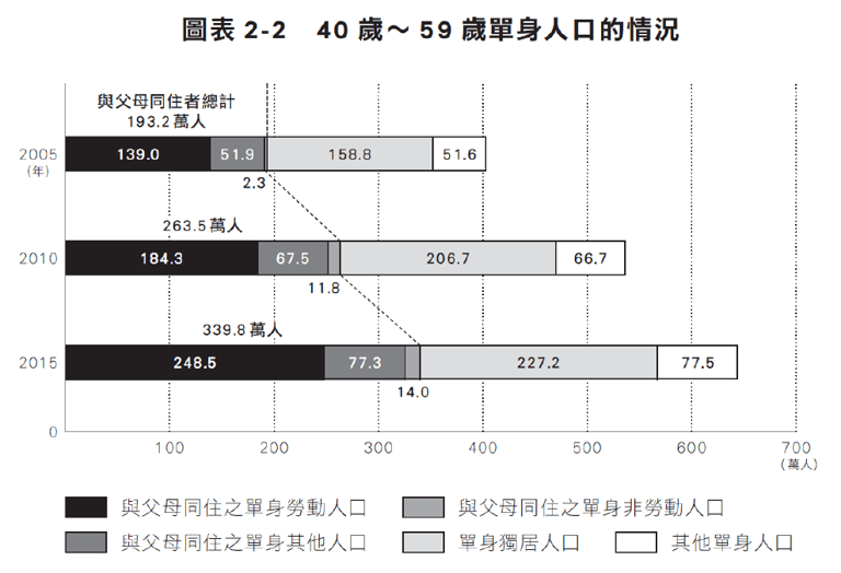 除了單身人口日漸增加,與父母同住的比例也逐漸提升。40歲至 59歲與父母同住者在 2005年為 193.2萬人,到了 2015年增加至 339.8萬人,與父母同住的總人數甚至超越獨居人口,其中無業人口為 77.3萬人(圖表2–2)。