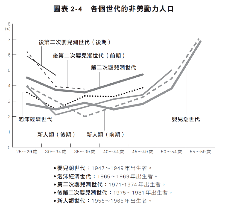 進一步分析 20歲至 59歲人口中各年齡層的「非勞動力」人口可以發現,無論是哪個世代,儘管一開始求職時不甚順利,大多數人在 30歲至 39歲時都能有個穩定的工作,非勞動力人口的比例跟著下降;進入 40歲至 49歲時離職率又再度提高,非勞動力人口隨之增加。其中又以第二次嬰兒潮世代,也就是 1971年至 1974年出生者(目前 45歲至 49歲者)的非勞動力人口比例持續走高(圖表2–4)。