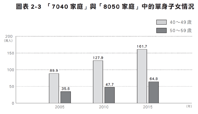 目前屬於「7040家庭」或「8050家庭」的人口日益增加。這些家庭的單身子女人數也隨之變化(圖表2–3)。