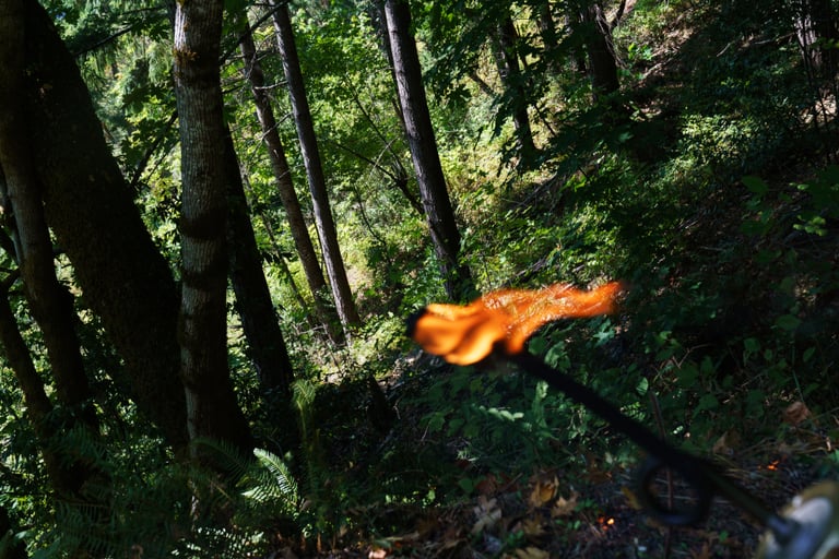 於是,一連好幾小時,拿著火炬的成員沿著斜坡往下移動,他們負責點燃森林,另一頭則有人遠端監控火勢,他們用無線電和現場進行聯絡,準備隨時介入,撲滅那些偏離預定放火範圍的火勢。