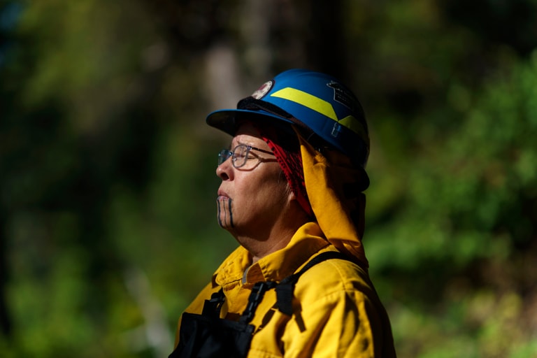站在北加州(Northern California)的山腰上,來自印地安部族尤羅克(Yurok)的阿祖茲(Elizabeth Azzuz)正閉上雙眼祈禱,她的雙臂朝向空中展開,右手高舉著用乾燥苦艾草製成的火炬——這是她的祖先代代相傳的工具,能夠用於燃燒密集的灌木叢。