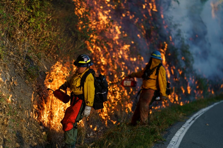 這是「蓄意」的放火,但不是為了破壞。在火焰燃燒灌木的時候,穿著防護裝備的工作人員監控著整個過程,消防設備跟水車都在一旁待命。