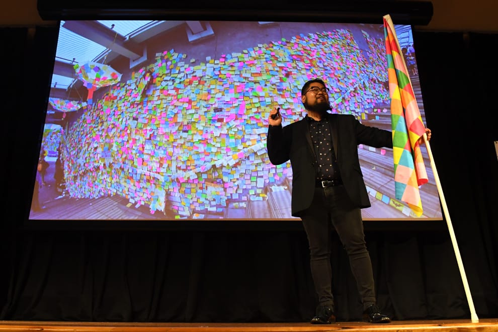 早年,巴丟草曾是中國藝術家艾未未的助手,隨後才轉型為在網路上創作諷刺中國時政的諷刺漫畫家。圖為巴丟草在 2019年香港反政府示威運動期間,於澳洲一場聲援香港人的演講「若水:香港vs中國」(Be Water: Hong Kong vs China)上的照片,畫面右側的旗幟是他以連儂牆為靈感創作的「連儂旗」。