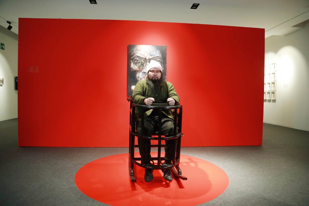 美聯社 / 達志影像在展覽開幕當天,巴丟草本人也化身為一件展品,坐在一張酷刑椅上閱讀COVID-19疫情期間一份由武漢市民撰寫的日記。