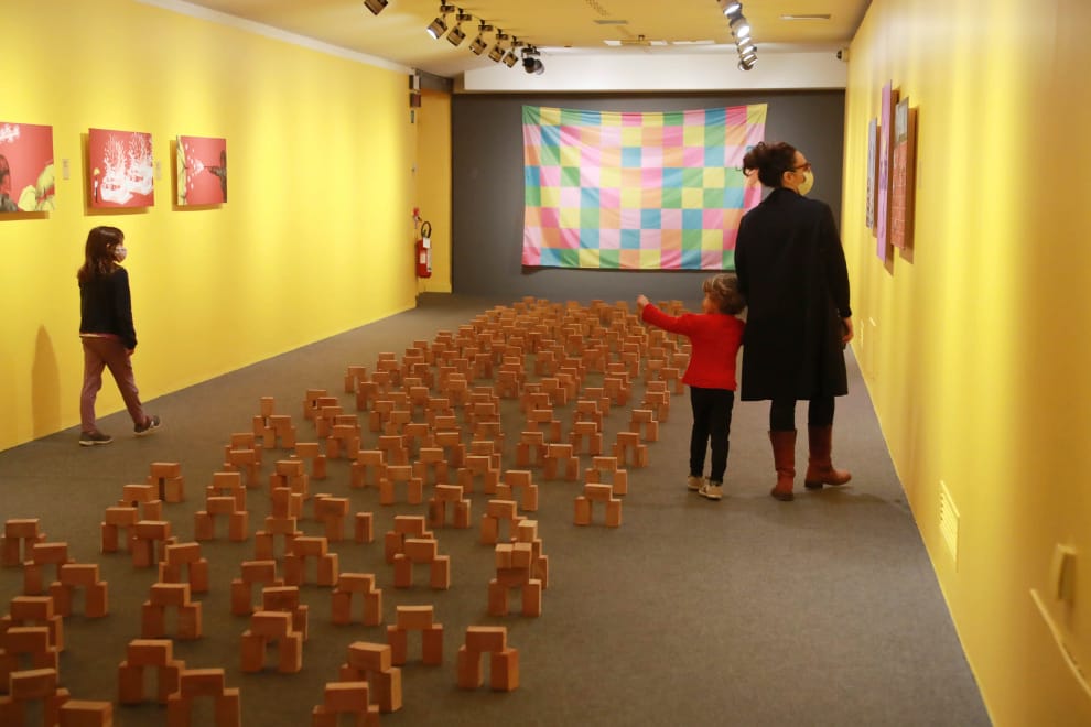 在巴丟草的展覽「中國(沒有)近在眼前」上,觀眾們正在欣賞巴丟草創作的藝術品,地上三個為一組的磚塊組是香港民眾在示威期間用以阻止警方推進的磚陣。