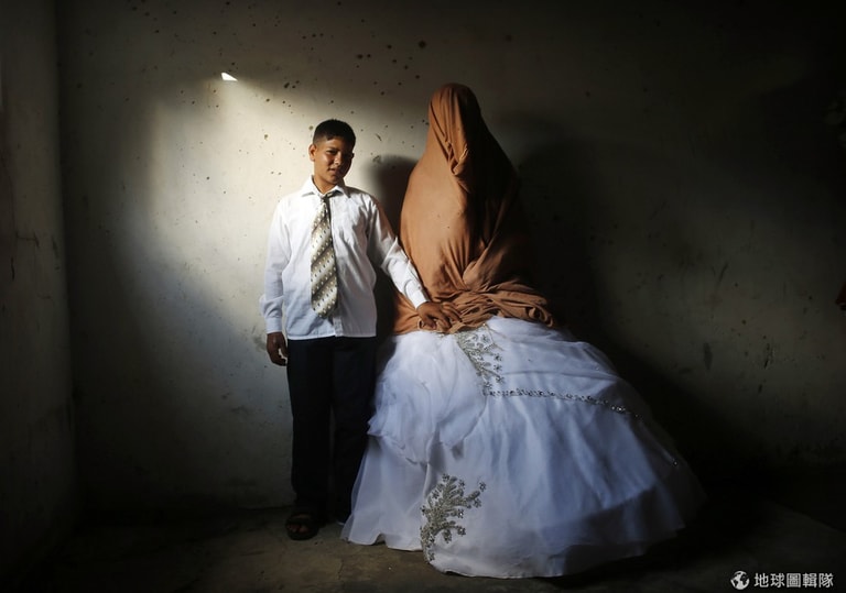 照片中左邊是年輕的巴勒斯坦新郎阿美得(Ahmed Soboh),15歲的他正站在他的新娘──14歲的塔拉(Tala)身邊;正要舉行婚禮的兩人站在塔拉的家中。塔拉的家位在以色列和加薩走廊邊境地區,這邊在2009年時受到以色列攻擊行動波及。
