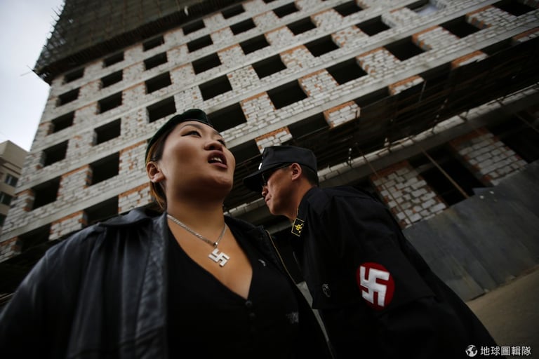 照片中站在烏蘭巴托一處建築工地旁的人們,左邊是烏爾安嘉郭(Uranjargal),另一位則是阿里烏恩柏德(Ariunbold),他們是蒙古國當地的新納粹團體「白色萬字黨」(Tsagaan Khass)的領導人。