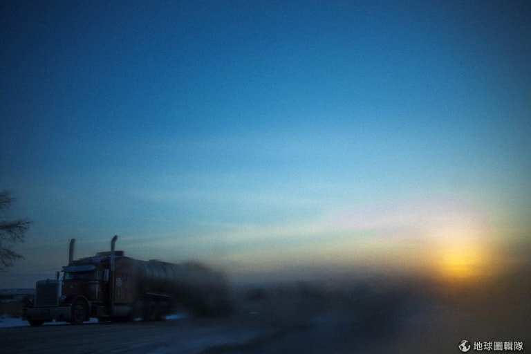 北達科他州當地,清晨朝陽剛升起時,從結霜的窗外望去可看見一輛卡車開過。