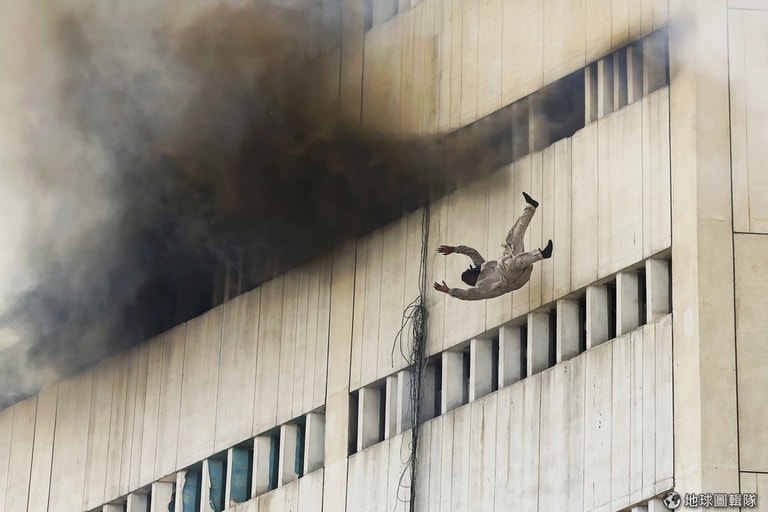 巴基斯坦的拉合爾市區中,一名男子從起火的大樓中墜下。