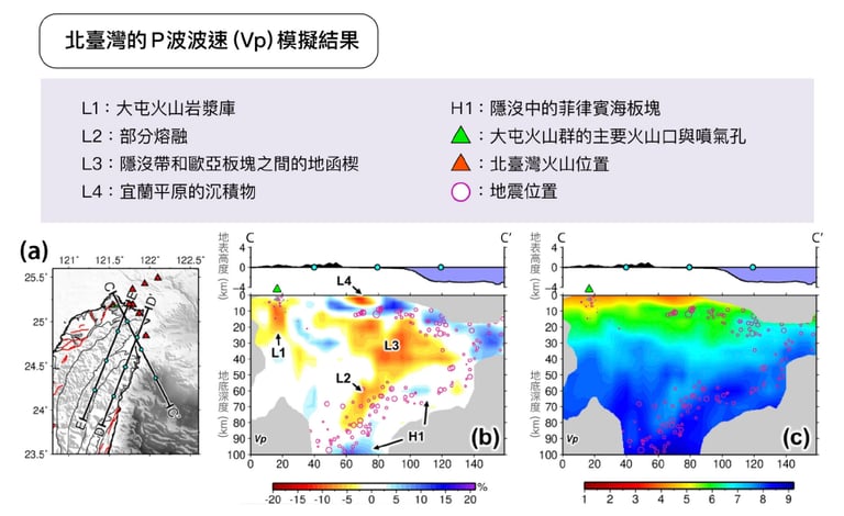 而在上圖(b)中,我們可以從紫色的小圓圈的分布看出菲律賓板塊隱沒產生的地震帶,以及隱沒後出現的部分熔融區(紅橘色的 L2)。