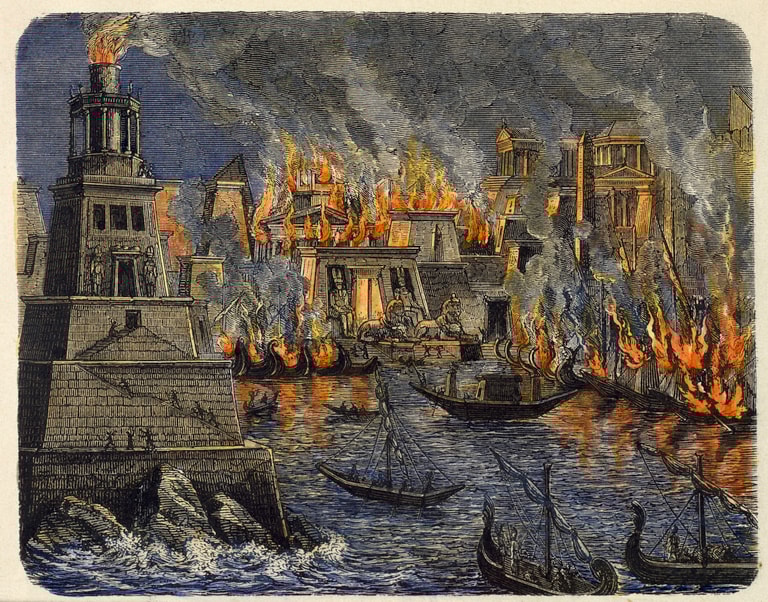 火燒古代圖書館,最為人所知的一棟是埃及的亞歷山卓圖書館。雖然史書上常轉述此事,其實世上對這座圖書館的認識不多,既查不到建築外觀,連確切地點也不詳。據說,亞歷山卓圖書館富藏五十萬份文件與手稿,有一百名駐館員工。據稱該館曾數度遭火劫。第一次是西元前四八年,發生在凱撒入侵亞歷山卓港的時候。凱撒的目標並非圖書館,而是火燒港口後才燎原至該館。圖書館後來重建,書重新上架,但亞歷山卓隨後戰火再起,圖書館又遇難,每次又重獲新生。