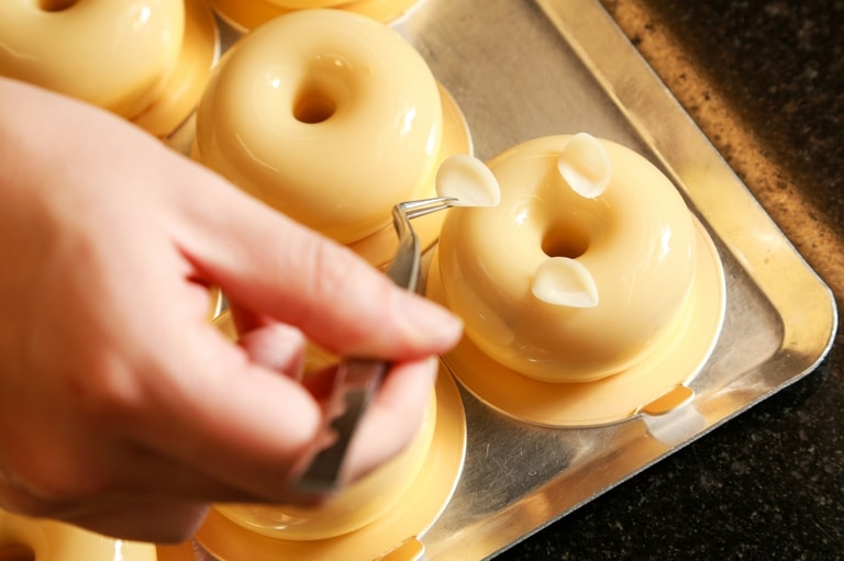 另一種是將巧克力變成巧克力甜點,《巧克力時尚之旅》把這一類型的師傅,稱為巧克力「熔煉師」。這樣的形容聽起來很浪漫,有點石成金的意味,卻很貼切。因為巧克力變成甜點的過程,要先以約 50℃ 高溫融化後,慢慢降溫處理。「正確調溫的巧克力,表面會有一層溫柔的光澤,像玉一樣。」