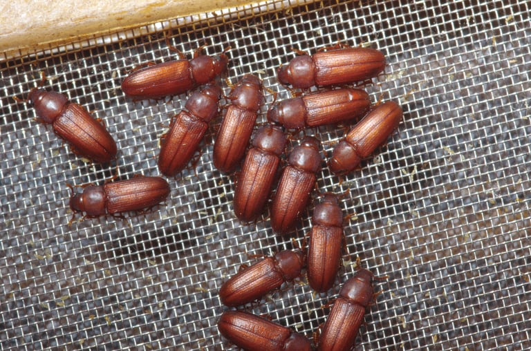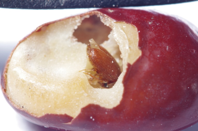 很多乾燥的堅果、種子製品是由國外進口,這類食品常被當成零食,或添加在料理中。如果在食品包裝裡發覺明顯的粉狀碎屑,或堅果表面有些許蛀洞,這些跡象通常與甲蟲類有關。