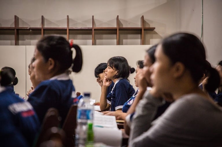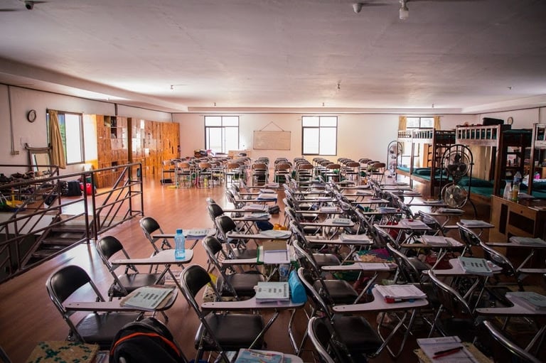 往二樓走,還有一個特殊的班級,他們是已經去過台灣、現在在等待第二份工作合約的移工。白天,這裡是他們的教室,到了晚上,堆疊在後方的軟墊一鋪、枕頭一拿,就成了這三百多人的房間。
