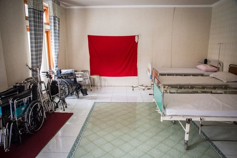 「那他們要怎麼學習照顧人呢?」老師引導我們到室外另外一區,那邊有三個房間,三個房間內有不同的場景。一間擺了病床、輪椅和一些醫療設備。一間是嬰兒房,有嬰兒床、假的嬰兒。另一間則是擺了洗衣機和其他家電。