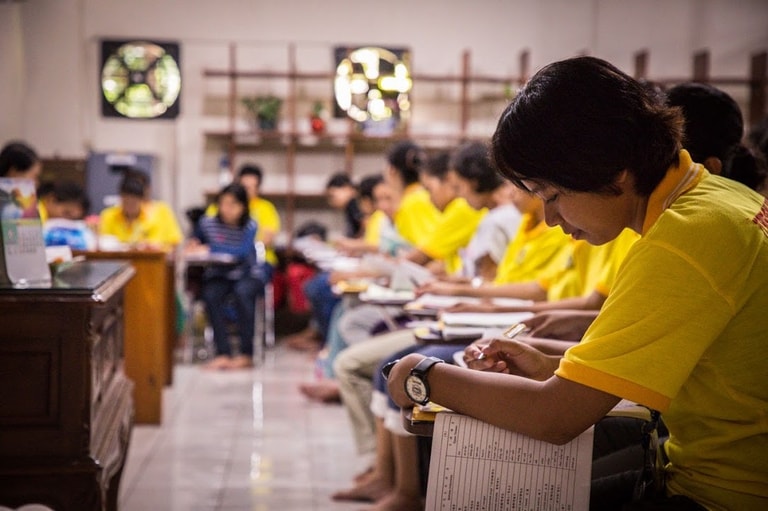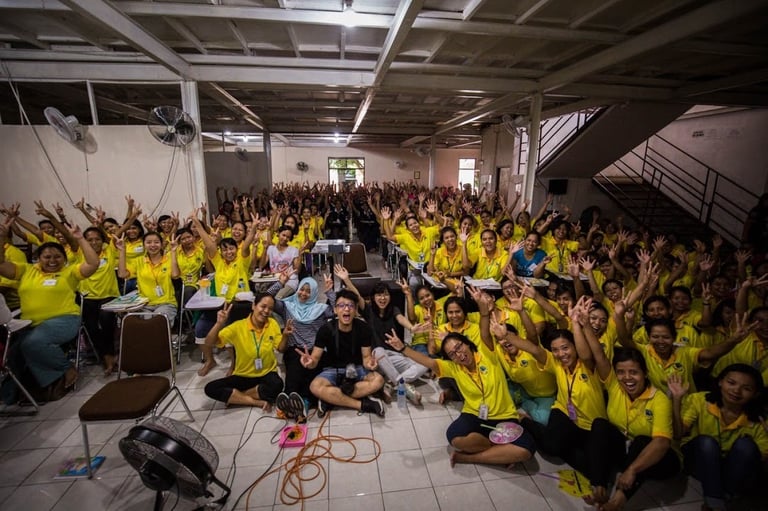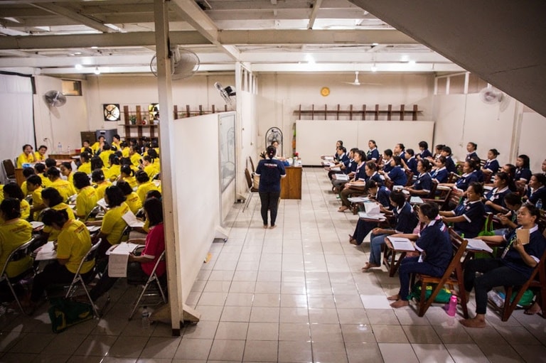 「那你們要不要直接上一下中文課呀?」仲介訓練所的老闆娘在得知 One-Forty 做的事情之後,便邀請我們直接現場教中文。老師們幾乎是動員了整間仲介訓練所,把原先兩片隔板拉門打開、把在二樓的學生也叫下樓來聽課。問題是,只有一個白板、一支雜音不斷的麥克風、三個不同目的地的工作國、三百多個語言能力各不相同的學生,我們該怎麼教才能讓每個人都至少學到一點什麼、為這個死寂的課堂注入一些學習該有的活力?