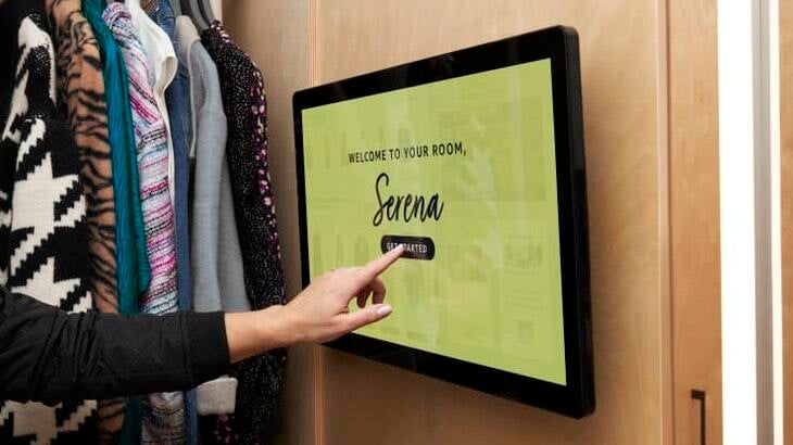 如果消費者有興趣,可以點擊 App 裡按鈕,將該商品「放入」試衣間,店員會將商品送到門市裡的試衣間內。試衣間配有電子螢幕,顧客可以在試穿後針對這件衣服進行評分,或再按鈕選擇試穿更多商品,店員就會直接送過來,顧客無需再踏出試衣間。