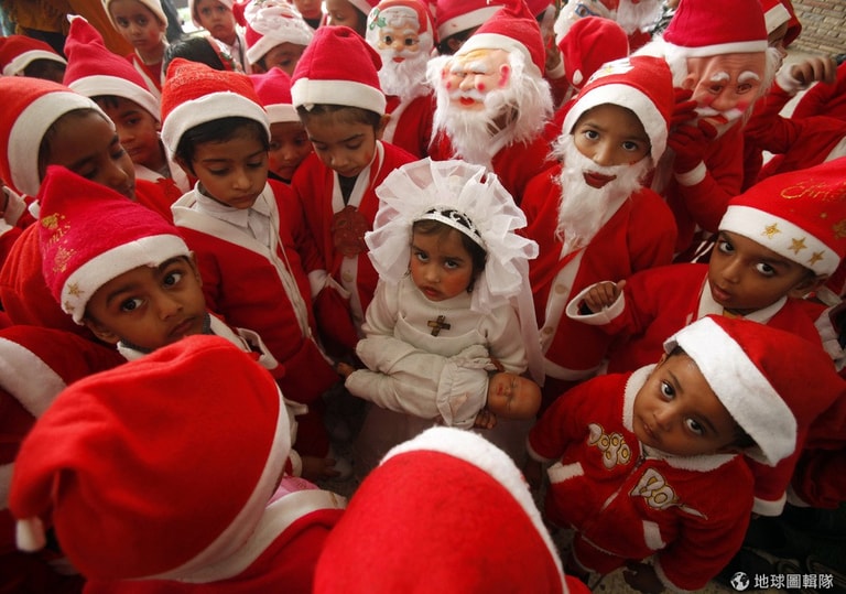 印度北邊昌迪加爾省一處教堂前,穿上聖誕老人裝的小朋友們圍著穿著聖母瑪利亞裝的小女生